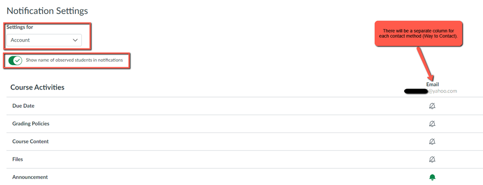 You can view and set notification preferences for your account or for individual courses. Notifications set at the individual course level will override any account level notifications. You can also toggle on Show name of observed students in notifications if you observe more than one child. This will add the student’s names to each notification so you know who it is for.