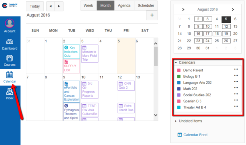The calendar will give you an overview of what is going on in each course. You will be able to see assignments, quizzes, and events that have been posted by the teacher(s).