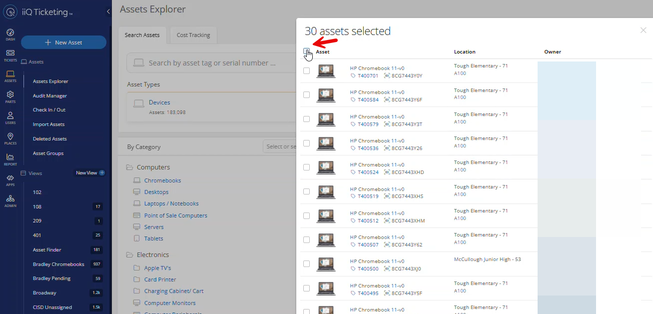 Once you have scanned the batch, click the Select All checkbox to select all the assets on your list.