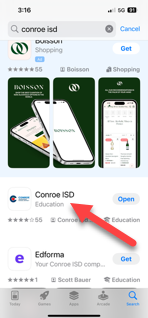Search your app store for Conroe ISD, then Click “Get or Download” and use your phone’s app store PW to load.