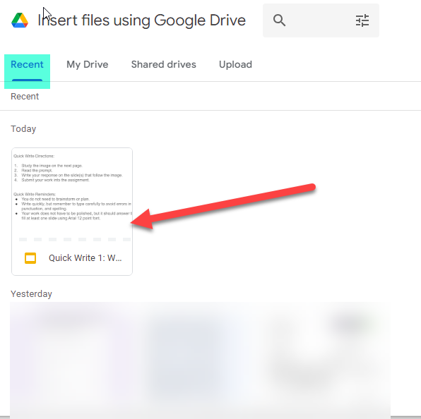 You will need to select the file from your Google Drive to attach to the assignment. The file should be at the top under resent. After you select the file click on “Add”: