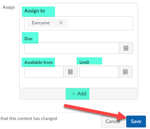 Make sure to review all the “Assign to” information and make any changes as needed to Sections, Due, Available From and Until dates and finally click on “Save”: