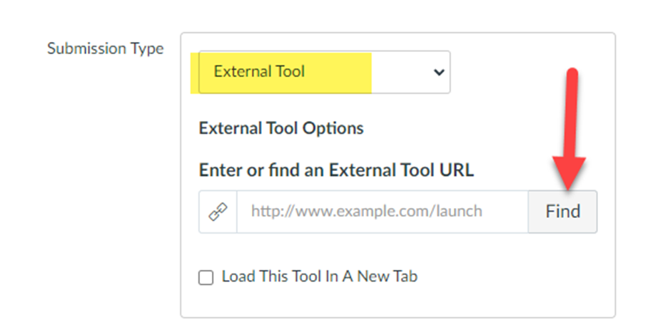 In Submission Type you will select External Tool, then click on Find.
