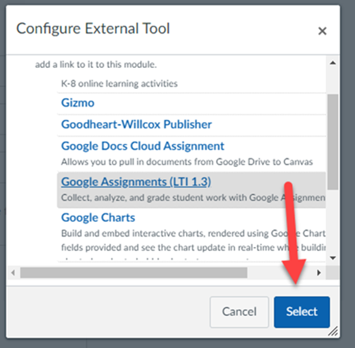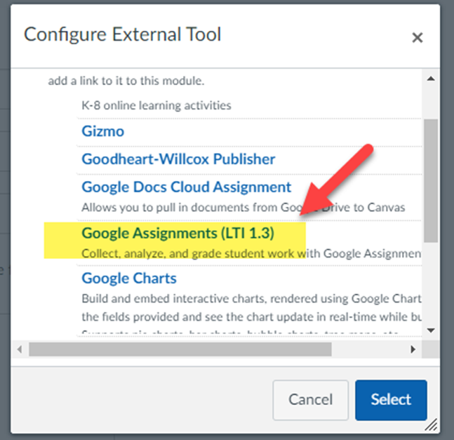 In the Configure External Tool pop-up window scroll down until you find and click on Google Assignments (LTI 1.3) and click Select.