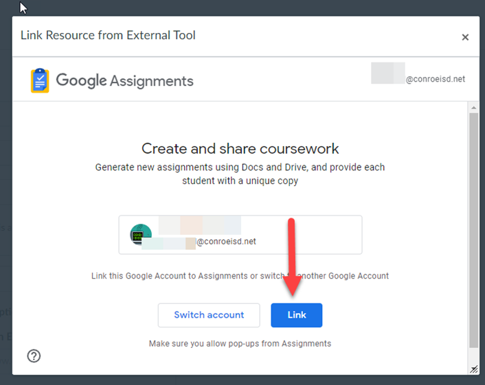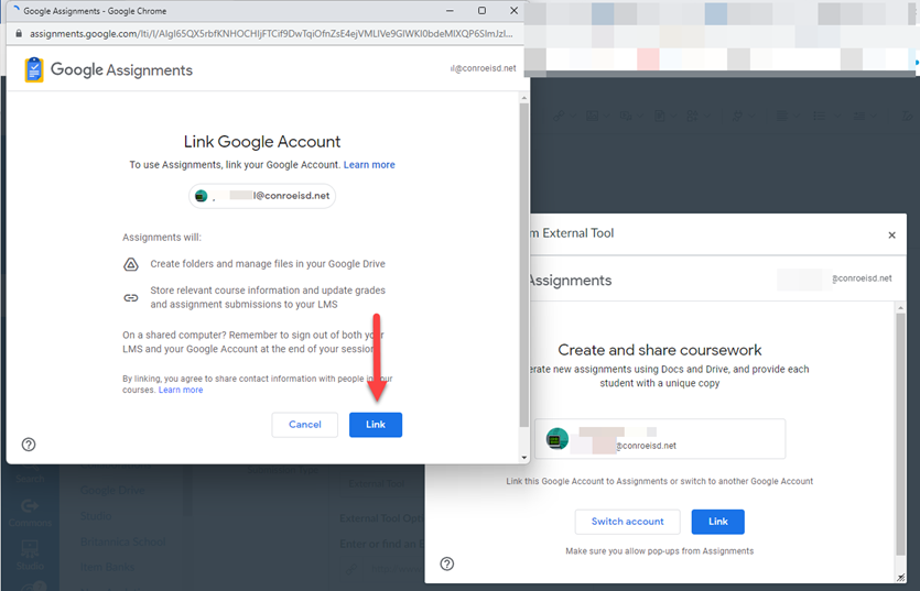 The Link Resource from External Tool window will open, and you will see your District Google Drive account. Click on Link. If you do not see your account, you have the option to switch accounts to your District Google Drive account.
