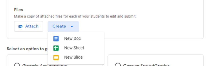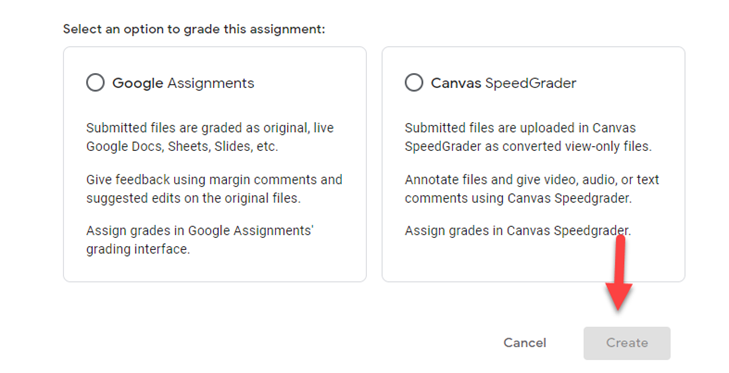 Select an option to grade this assignment with Google Assignment or Canvas SpeedGrader. Once you make your selections click on Create.