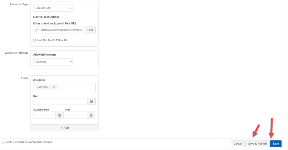 Finish building your assignment by continuing on to Submission Attempts and Assign sections. Click Save once you have completed each field or you may choose to Save and Publish if you are ready for students to access the assignment.