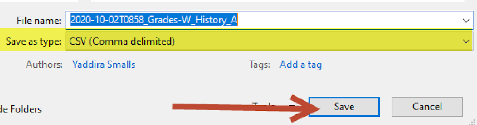 I went ahead and did “Save As” to my desktop. Make sure the file type is “CSV (Comma delimited):