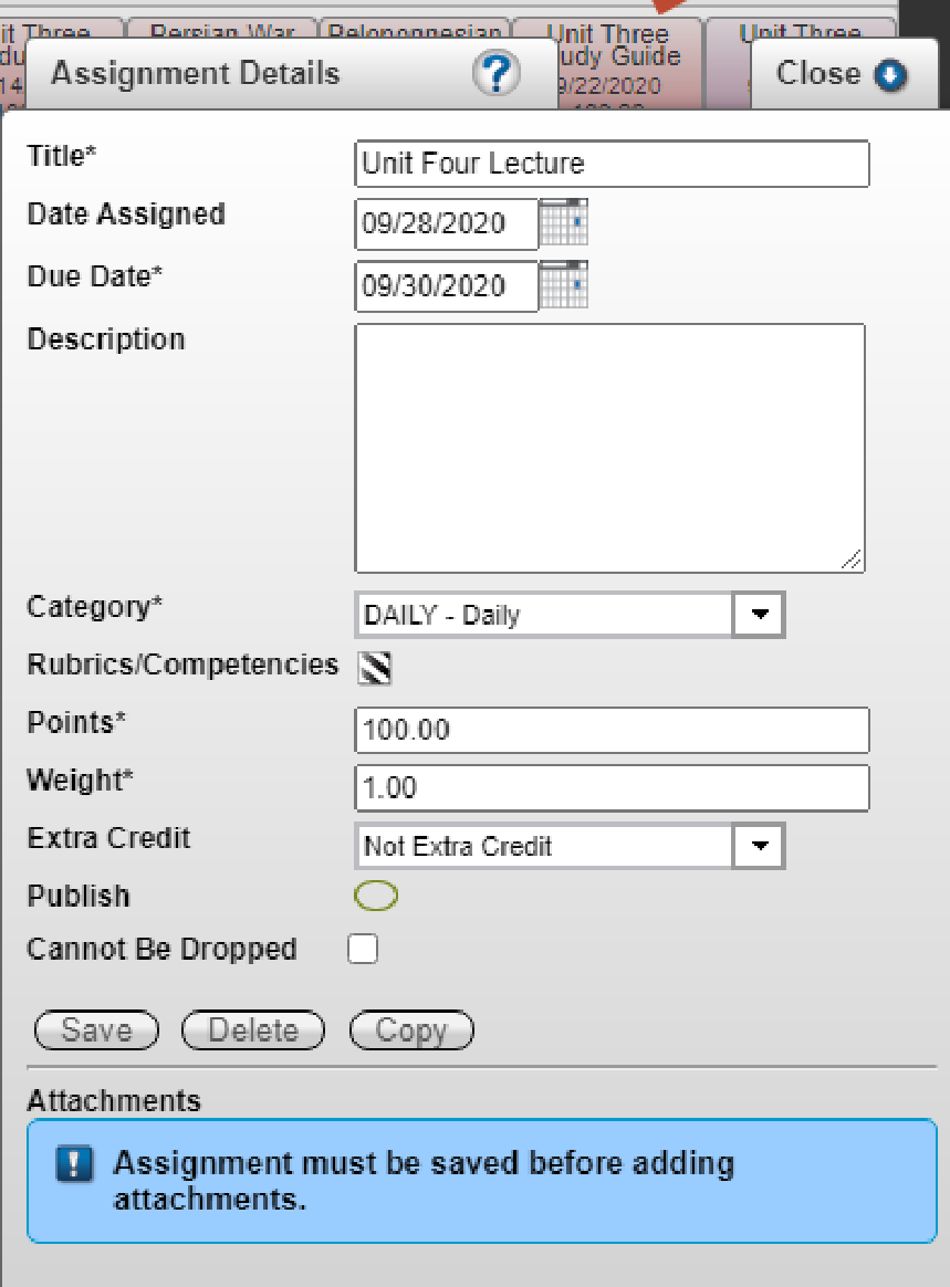 Select “Add Assignment” icon and fill in all applicable fields and “Save”: