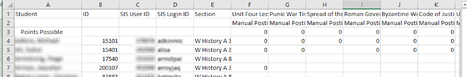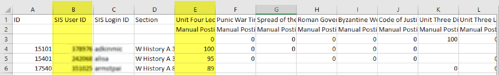 There are only two columns you will need, the SIS User ID and the assignment scores (yellow):