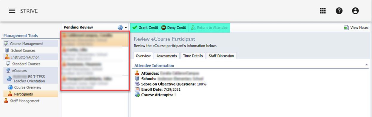 You will see names of all pending participants under “Pending Review”. If you do not see the teachers name then that means they still have not requested credit, they must do this step before you are able to grant credit.