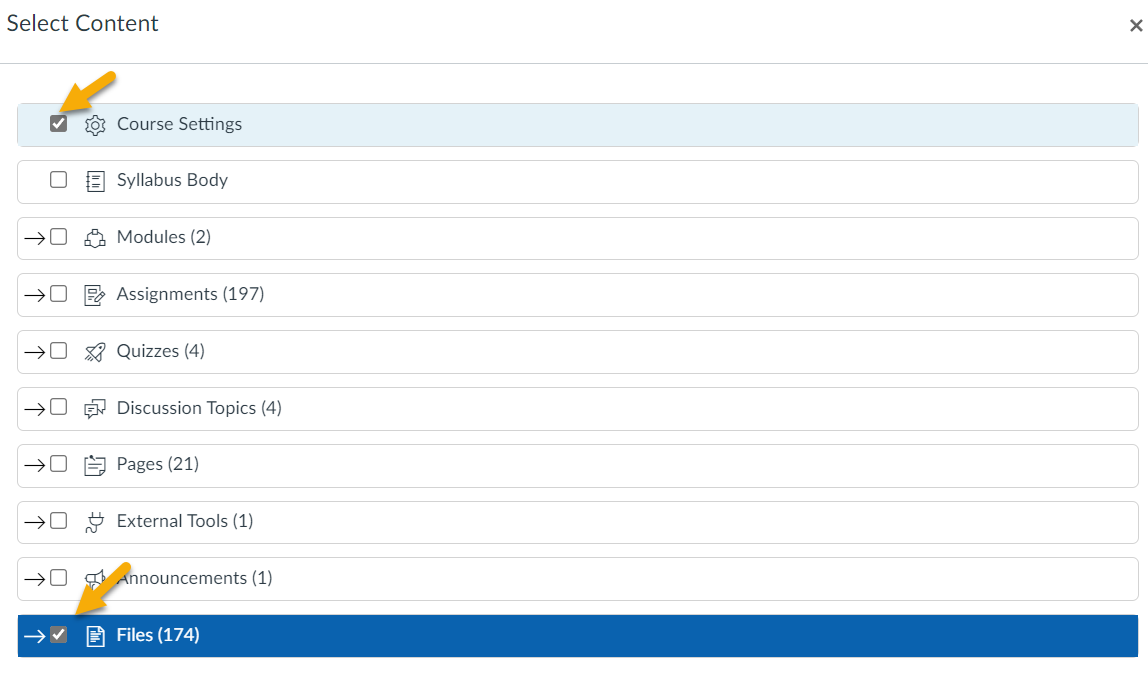 Assignment-Related Content: Any assignments (including associated quizzes and discussions) will be imported as part of the assignment.