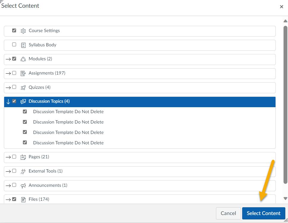To import individual items, click the arrow to expand each group and select specific items to import. After making your selections, click Select Content.