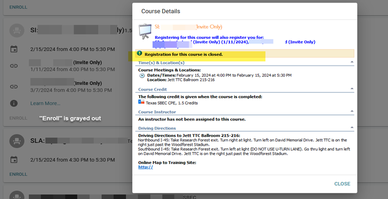 Find the course you wish to take and click the down arrow next to its title. You will notice the "Enroll" option is grayed out.