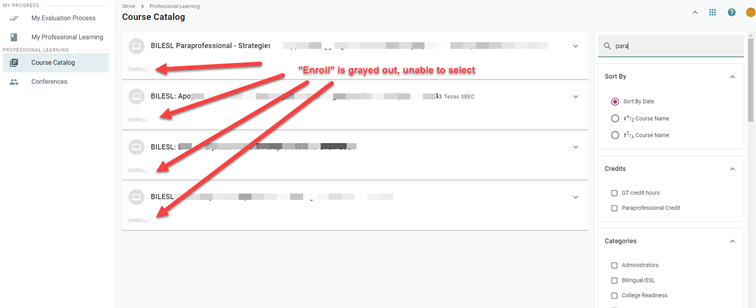 There are several possible reasons why you might encounter difficulties when trying to sign up for Professional Learning within Eduphoria Strive platform. If the Enroll button is grayed out, Strive will tell you exactly why—but you have to know where to look.